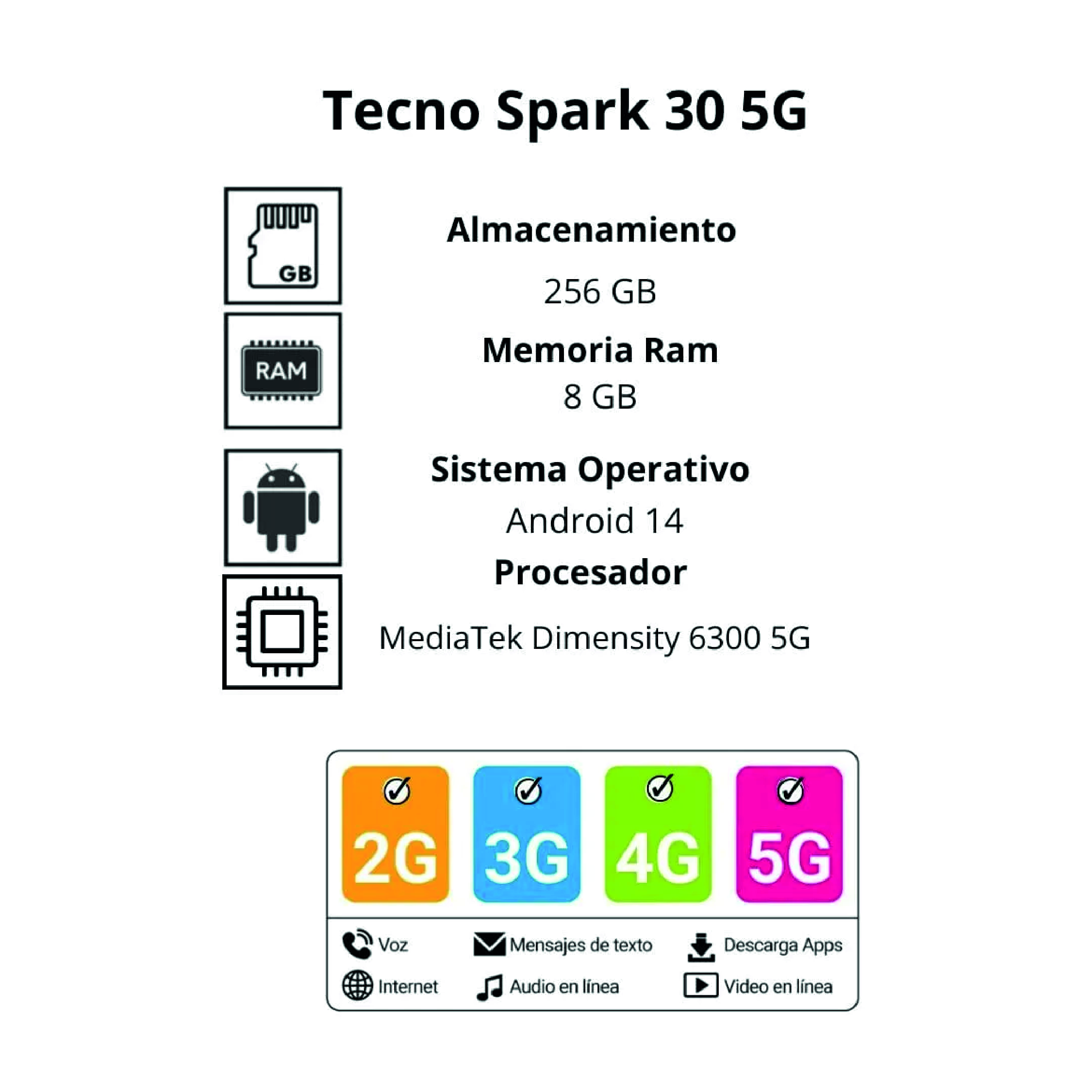 Descubre el TECNO Spark 30 5G, donde el poder que transforma se hace realidad. Con su espectacular pantalla de 6.67» Hole Display HD+ y una tasa de refresco de 120Hz, disfrutarás de imágenes suaves y vibrantes. Equipado con el potente procesador MediaTek Dimensity 6300, ofrece un rendimiento fluido y rápido. Captura tus mejores momentos con su cámara principal de 108MP y comparte selfies impresionantes con la cámara de 8MP. Con 256GB de ROM y 8GB de RAM con 5 años de fluidez asegurada, este smartphone está listo para todo. ¡Transforma tu experiencia y adquiere el tuyo hoy!